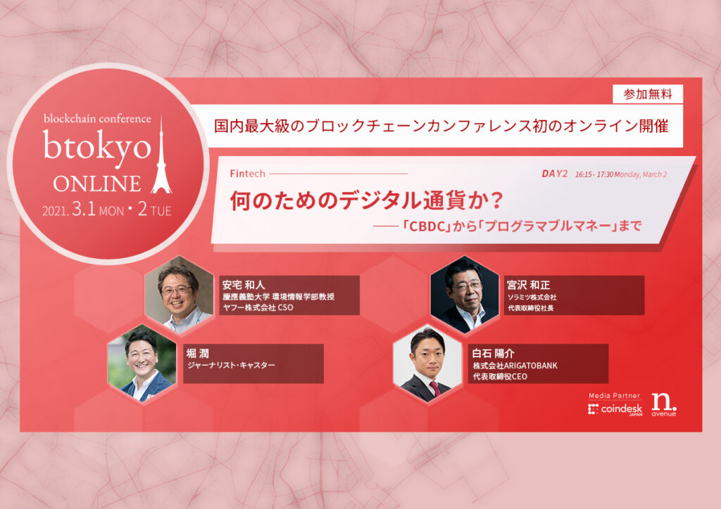 The post 何のためのデジタル通貨か?──慶大・安宅教授、ソラミツ代表らが議論【3/1-2開催 btokyo ONLINE 2021】 first appeared on CoinDesk Japan |…