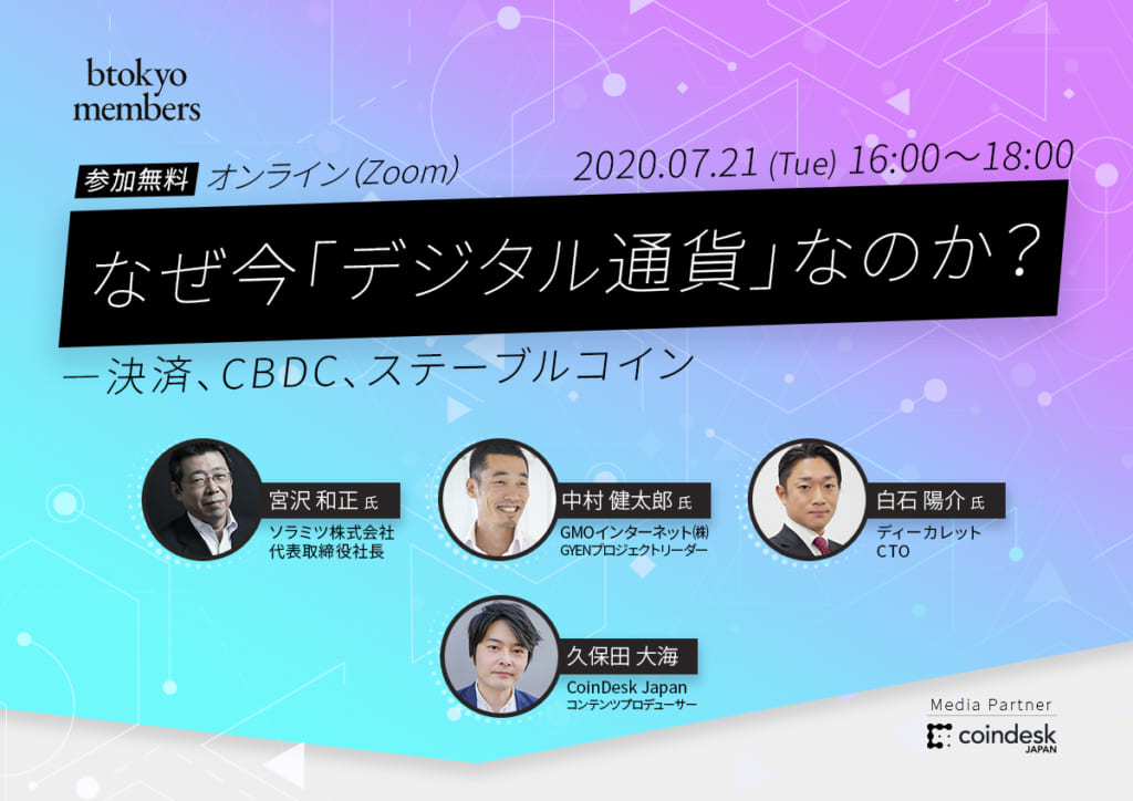 オンラインイベント「なぜ今『デジタル通貨』なのか?―決済、CBDC、ステーブルコイン」が、7月21日(火)午後4時から開催される。参加は無料で、btokyo m ...